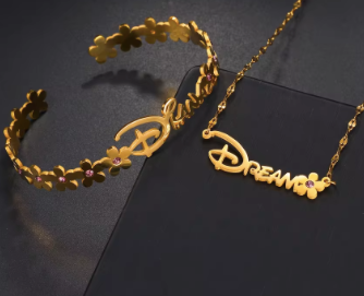 Personalized stainless flower name necklace and bracelet set